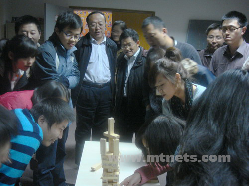 柴教授、赵博士饶有兴趣地观看员工娱乐活动